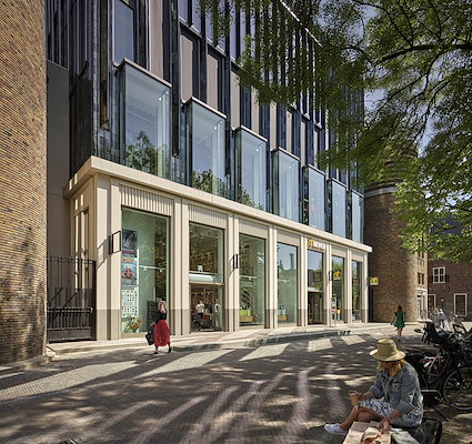 (interieur en casco ingrepen bibliotheek Neude) renoveerden het monumentale postkantoor en voegden aan de zijde van de Oudegracht een nieuw volume toe. De functies, waaronder verder ook een café, zijn verspreid over beide bouwdelen.