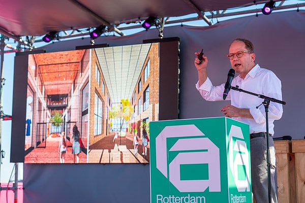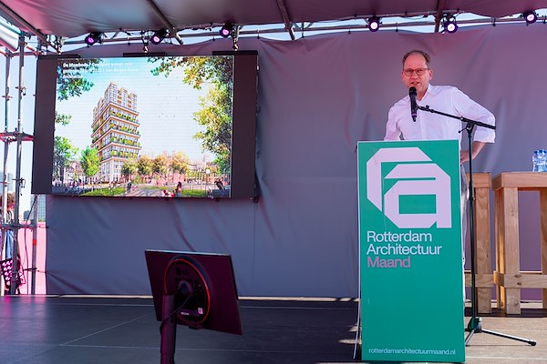 Het tijdelijke podium op het dak van Het Nieuwe Instituut in Rotterdam was afgelopen woensdag 22 juni de locatie voor het symposium ‘Gestapeld wonen voor gezinnen’. Architectenweb organiseerde deze bijeenkomst binnen de Rotterdam Architectuur Maand. Vijf architecten presenteerden de belangrijkste inzichten uit hun onderzoeken en de praktijk. Hoe kunnen we vormgeven aan de gezinsbuurt op hoogte?