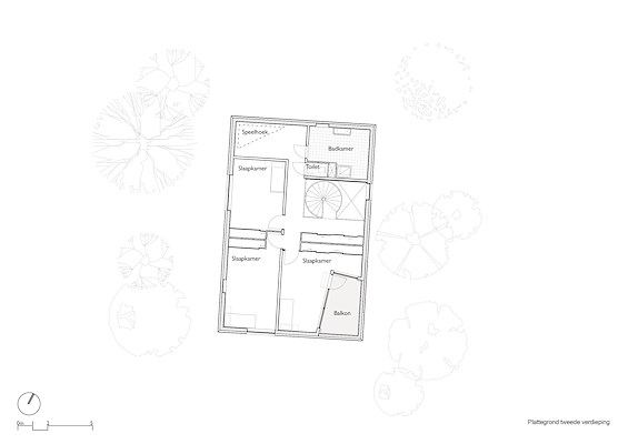 gerealiseerd. Landschap en geborgenheid staan centraal in het ontwerp. Door een open plint ontstaat een optimale verbinding met de tuin en de omgeving. Daarboven – als tegenhanger – zweeft een gesloten volume dat de slaapvertrekken en een werkruimte herbergt. Het huis is ontworpen voor een familie die veel ruimte vroeg, maar een bescheiden huis wilde.