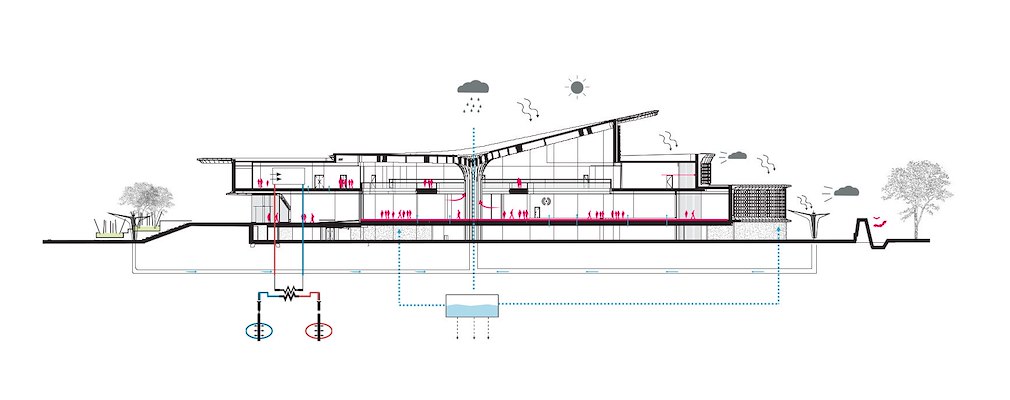 Er is volgens MVSA relatief weinig beton toegepast en waar mogelijk gerecycled materiaal. Het dak is voorzien van een photo-voltaïsche folie. De bloemvormige sculpturen op het parkeerterrein dienen niet alleen als zonnescherm, maar vangen ook wind met het oog op de ventilatie van het gebouw.
