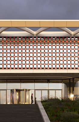 De van kleur veranderende gevel draagt verder bij aan het gebouw als blikvanger voor voorbijgangers en bezoekers. De gevel is uitgerust met een grid van ronde glazen fiches, afgewisseld met een grid van kleinere metalen fiches. Door de speciale coating veranderen de metalen fiches van kleur als men langs het gebouw beweegt, wat overdag zorgt voor een levendig beeld, zeker gezien vanaf de snelweg.