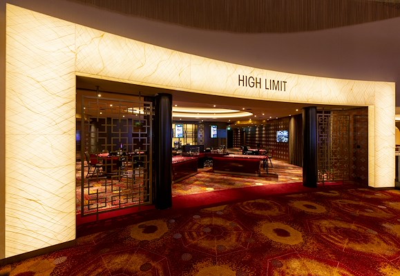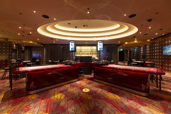Het uitnodigende en ruimtelijke entreegebied omvat de receptie en de garderobe, gelegen aan weerszijden van de entree naar het casino. De hellingbaan naar de