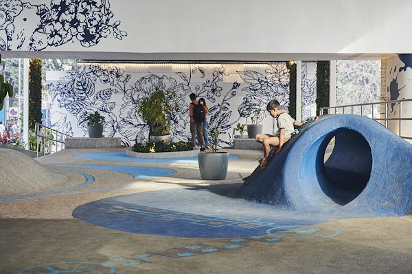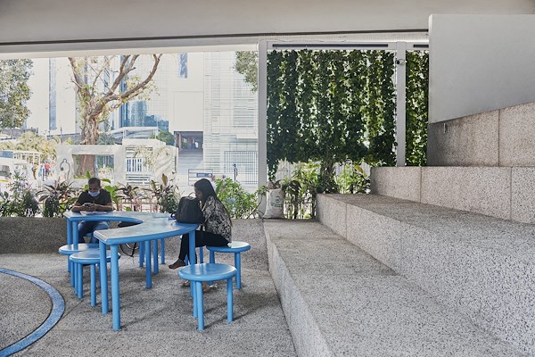 De openbare ruimte werd verdeeld in een aantal openbare ‘kamers’ met verschillende functies, van een lounge en fitnessruimte tot een schaduwrijke zithoek en een leesruimte. De hele ruimte is beplant.