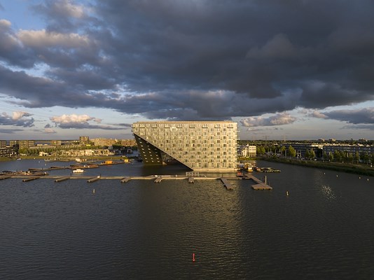Om het gebouw op zijn juiste waarde te schatten, moet je de binnenplaats bezoeken of het water op. En gelukkig – een van de grote kwaliteiten van het project – kan dat allebei. De ‘courtyard’, waar boten kunnen aanmeren en gezwommen kan worden, is publiekstoegankelijk. En om het water op te kunnen heb je geen boot nodig, want er liggen vrij te betreden aanlegsteigers rond het gebouw.
