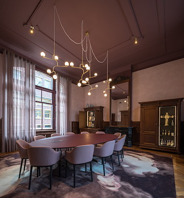 In het interieurconcept is de inrichting verbonden aan de verhaallijnen en collectiestukken van het biermerk, legt MARS Interieurarchitecten uit. Ruimten met een hoge monumentale kwaliteit kregen een bijpassend stijlvol interieur; ruimten met minder monumentale waarde kregen een inrichting met sterk grafische kenmerken.