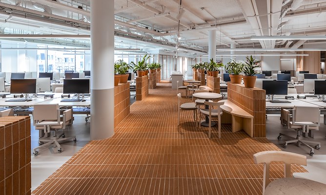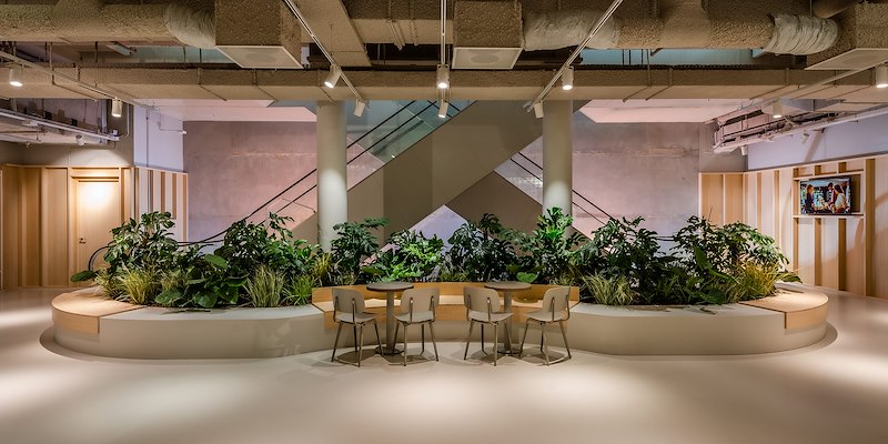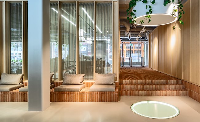 De sociale plekken op elke verdieping bieden ruimte om af te spreken of samen te werken, zonder andere mensen te storen, meldt TANK. Een nieuwe stalen trapconstructie, die is bekleed met bamboehout, verbindt alle verdiepingen en heeft grote treden waarop de medewerkers kunnen ontspannen en praten met collega’s.