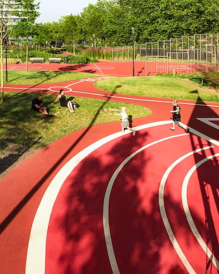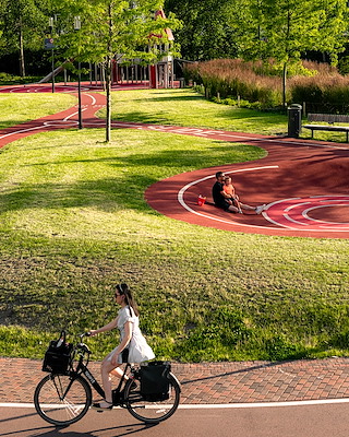 De sport- en speelplekken liggen net als ruimtes om te picknicken of zonnen (of juist schaduw op te zoeken) aan een meanderende route voor wandelaars en fietsers. Wie de paden volgt, komt telkens in andere sferen met bovendien verschillende uitzichten terecht. Ook is er een nieuw terras met een amfitheater en een waterelement gerealiseerd.