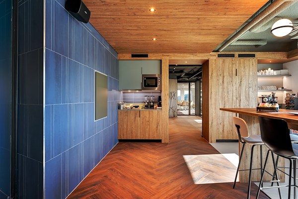 Ook is er een compacte, sfeervolle vergaderruimte, die met een bank en fauteuils op wielen makkelijk is in te delen naar de wens van het moment. Voor een optimaal comfort is de ruimte voorzien van zacht textiel in de vorm van gordijnen en tapijt. De fauteuils zijn gestoffeerd met een textiel uit meer dan 90% wol.