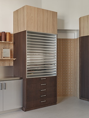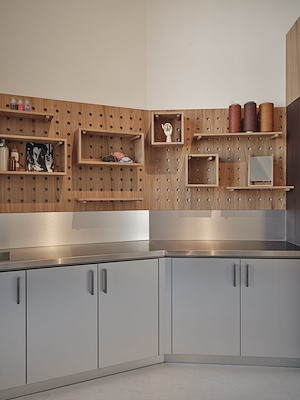 Voor de activiteitenruimte was het van belang dat alle meubels eenvoudig te verplaatsen of aan te passen zouden zijn. Centraal in de ruimte staan grote, vouwbare metalen tafels. De aanpasbare houten wanden bieden mogelijkheden om het creatieve werk van workshop-deelnemers te presenteren en materialen en gereedschappen op te bergen.
