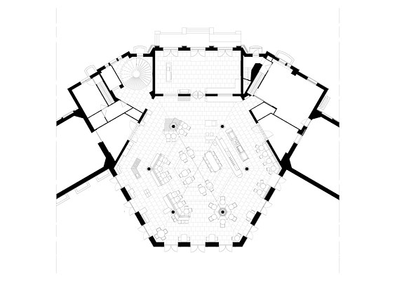 De open ruimte op de eerste verdieping, met zicht op Café Pierre is voorzien van een eikenhouten vloer die de zeshoekige vorm van de koepel volgt. Dit is de evenementenruimte waar openingen, extra tijdelijke exposities en groepsontvangsten kunnen plaatsvinden. De kroonluchter van het café verlicht ook deze hele ruimte.