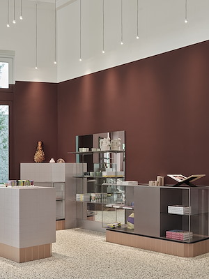In de toegepaste materialen in de zone van de museumwinkel heeft de ontwerpstudio een lichtere en verfijndere benadering gezocht. De verschillende presentatiemeubels bestaan uit glas en staal, met pasteltinten en spiegels als achtergrond voor de uitgestalde waren.