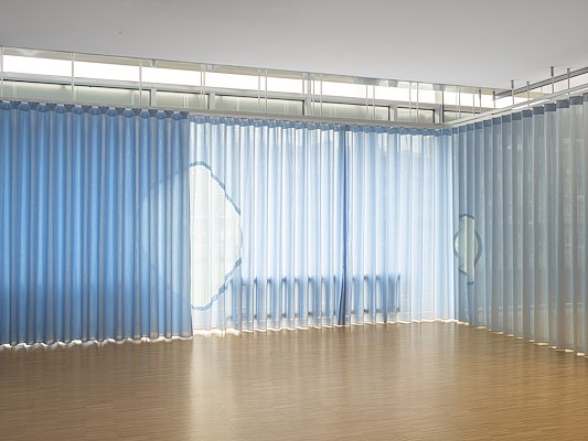 Vervolgens buigt deze wand zich in de educatieruimte, waar in het rode volume een pantry is opgenomen. De aanrechtbladen hebben verschillende hoogtes, geschikt voor volwassenen en kinderen. De multifunctionele educatieruimte is voorzien van een op maat gemaakt gordijn, waarmee de ruimte naar wens is in te delen. De combinatie van transparante en opake stof zorgt daarnaast voor verschillende sferen.