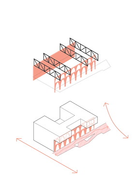 Om de keuze voor de programmatische indeling te kunnen verwezenlijken, dragen de wand met bogen en de scheidingsmuur aan de andere gebouwzijde vier grote metalen vakwerken. Deze vakwerken (ātrussesā- wat lang de werktitel van het gebouw was) zijn elk twee verdiepingen hoog. Ze werden over water naar de bouwplaats vervoerd, vertelt het architectenbureau.