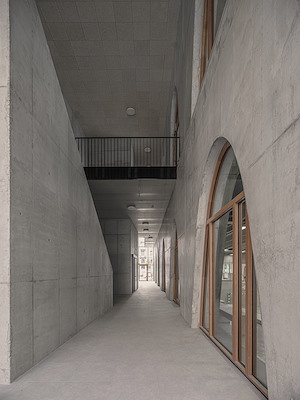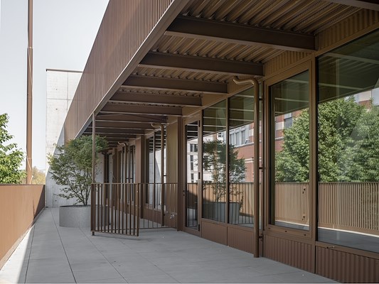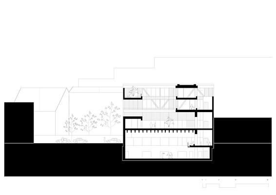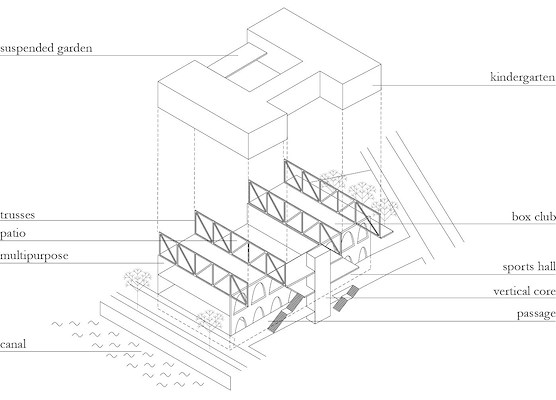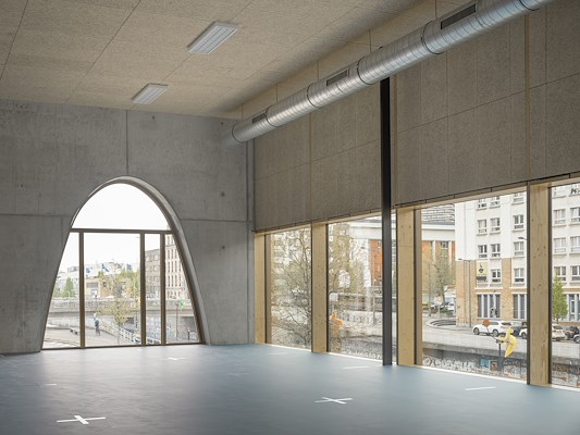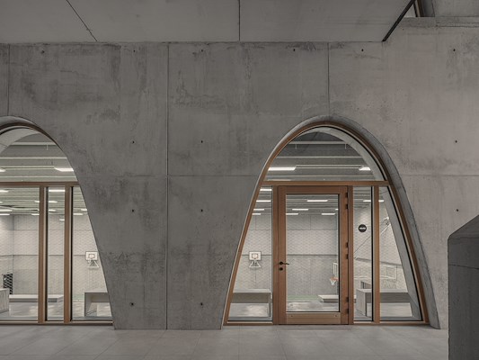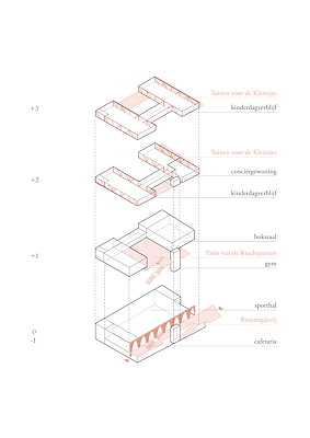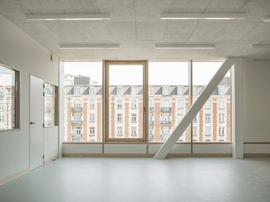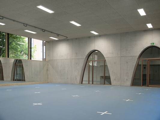 Hoewel het omwille van het draagvermogen logisch zou zijn het grote, lege volume van de sporthal bovenin het gebouw te plaatsen , heeft Bogdan & Van Broeck anders gekozen. Het bureau heeft dit grote volume op de lagere niveaus van het gebouw gesitueerd om een aantal redenen: het vergemakkelijken van de toegang tot de sporthal, de zichtbaarheid ervan vanaf de straat en daglichtinval in alle ruimten.