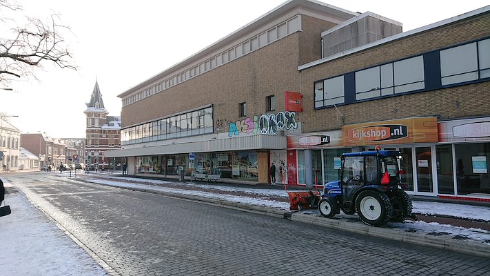 Op de plek waar aan het einde van de Tweede Wereldoorlog een verdwaalde bom het kantongerechtsgebouw verwoestte, opende in 1952 een nieuw, groot warenhuis. Het pand kenmerkt zich door zijn schaal, robuuste structuur en gesloten, sobere uitstraling.