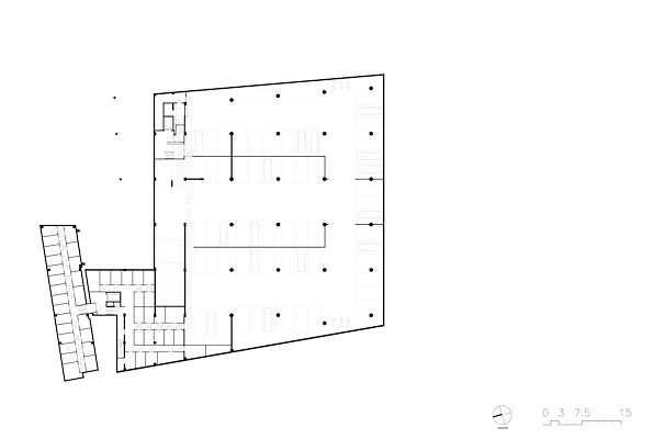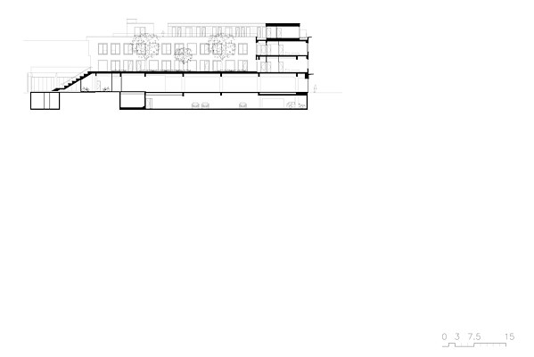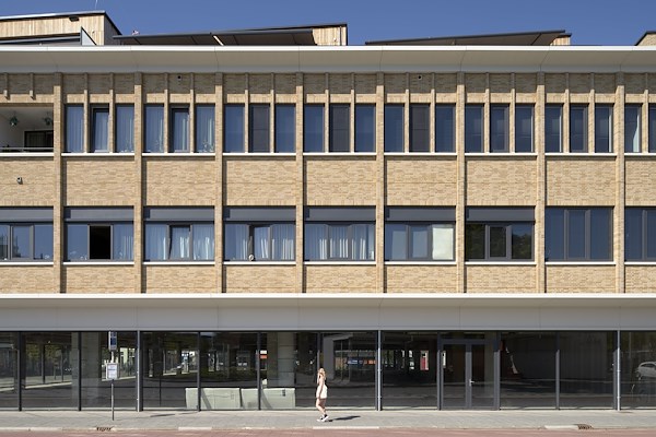 Het gesloten karakter van de oorspronkelijke gevel is vervangen door een heldere structuur van gemetselde penanten, kolommen en horizontale banden. Door het ritme van penanten sluit de gevel zich vanuit verschillende perspectieven en herinnert zo toch aan het voormalige gevelbeeld. De plint is, als voorheen, transparant en geschikt voor commerciële of publieke functies.