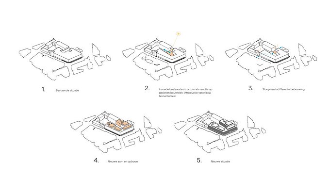 Het architectenbureau heeft de toegevoegde dakappartementen niet de wijkende gevellijnen laten volgen. Ze staan iets teruggeplaatst, waarmee, in de woorden van het bureau “een nieuwe, op zich staande wereld bovenop het bestaande” is gecreëerd. Een plek die zich onttrekt aan het rumoer van de stad en er toch bij betrokken blijft.