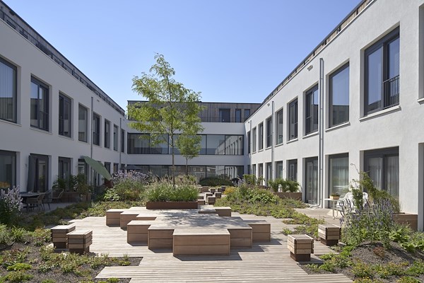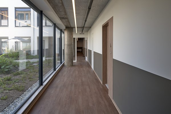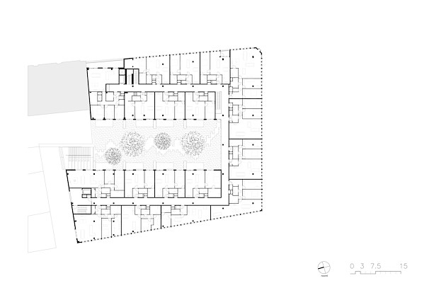 Deze gemeenschappelijke binnentuin vormt een luwte in de stedelijke omgeving en zorgt voor daglicht en ruimte in het hart van het gebouw brengt. Een corridor ontsluit de stadsappartementen, georiënteerd op de stad en op de binnentuin.