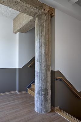 De oude constructie van het gebouw is zichtbaar gebleven in de appartementen in de vorm van de plattegronden. Kolommen, balken en vloeren kruisen nieuwe wanden en ruimten, waardoor oud en nieuw afzonderlijk afleesbaar zijn. De oude verdiepingshoogte van 4 meter geeft de woningen een bijzonder karakter. De installaties zijn veelal in het zicht gehouden.