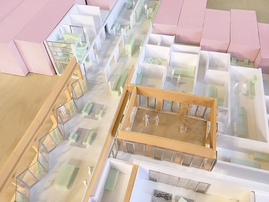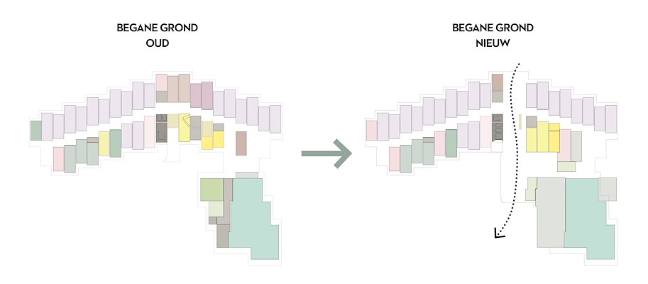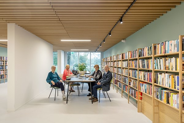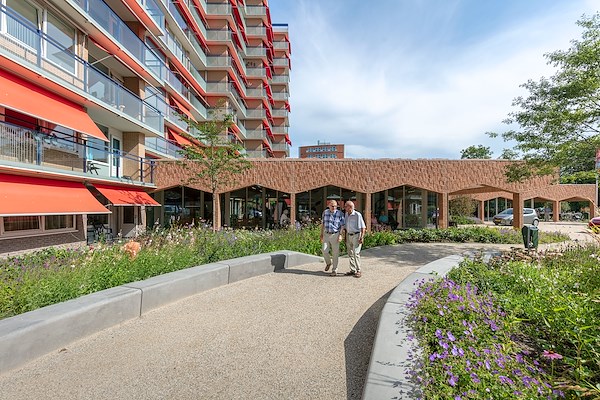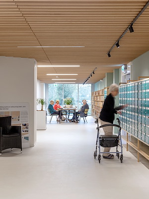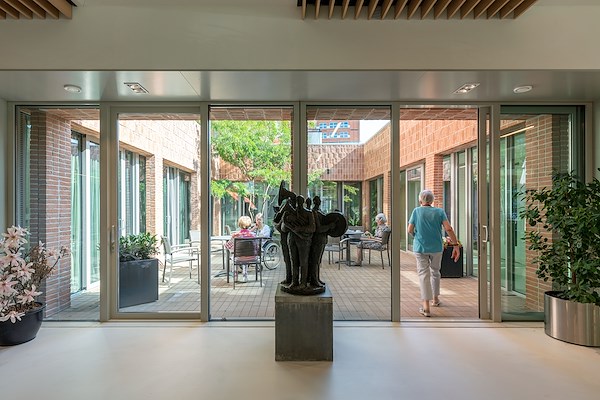 De ruimte loopt van de nieuwe entree door tot aan de achterzijde van het gebouw en zorgt voor licht, openheid en plekken voor ontmoeting. Bewoners kunnen in dit nieuwe hart hun post ophalen, een boek lezen in de bibliotheek, wachten op hun afspraak met de fysiotherapeut en gezamenlijk uitrusten en een kop koffie drinken.