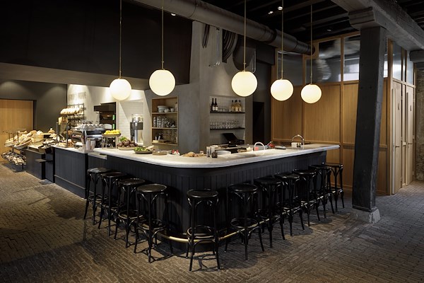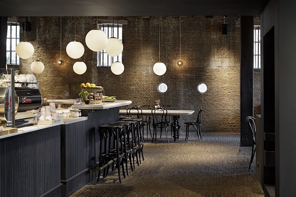 Een langgerekte bar buigt van het winkel- naar het horecagedeelte. Het zwart eikenhouten front en marmeren blad zijn hier doorgezet. Centraal in de ruimte staat een 12 meter lange eettafel met eveneens een wit marmeren blad. Boven de bar en de eettafel hangen originele glazen bollampen.