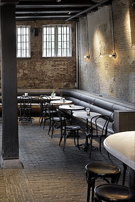 Het horecagedeelte is verder voorzien van een bank die zich langs drie muren strekt. Hieraan staan kleine tafeltjes met marmeren blad en de klassieke caféstoelen van Thonet, uitgevoerd is zwart. Deze stoelen en de variant als barkruk zijn ook aan de lange eettafel en aan de bar gebruikt.