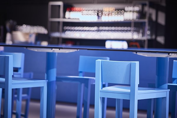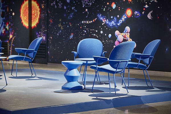 Blauw kenmerkt het nieuwe interieur van het Evoluon