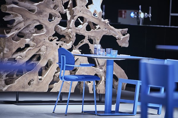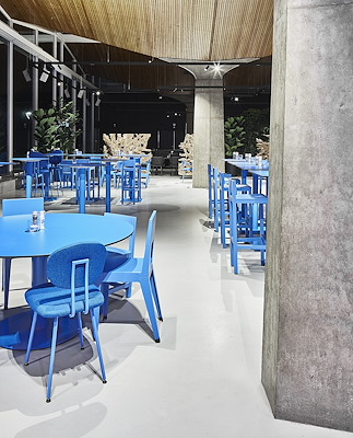 De bestaande objecten in het Evoluon zijn bekleed met OSB-plaatmateriaal; linoleum is gebruikt als afwerking van barbladen en vloer(eilanden). Het meubilair voor het terras, gerealiseerd in samenwerking met Vermaat, is eveneens consequent uitgevoerd in blauw. Hier is onder andere de Loop Chair van Stefan Scholten toegepast. Als uitzondering op de blauwe kleurstelling heeft M+R het à la carte-deel van het restaurant geheel uitgevoerd in zwart.