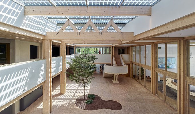Het concept is eenvoudig en slim. De eenheden waaruit het paviljoen is opgebouwd zijn in een andere configuratie, op een andere plek opnieuw te gebruiken. Ze bestaan uit houten delen die zijn gekoppeld met knopen uit hergebruikt staal. De jury is erg te spreken over het hoge atrium waar het de houten draagstructuur overheen loopt. De structuur omringt de bezoeker. Met de lamellen in de gevel en de louvre-ramen voor het binnenklimaat, de opvang van regenwater en binnenwanden in verschillende biobased materialen bevat het project vele duurzame oplossingen en tegelijkertijd is het paviljoen – binnen en buiten – een genot om te zien.