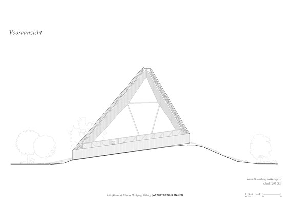 ”, laat Archtectuur Maken weten. “Tegelijkertijd vormt de driehoek een symbolische toegangspoort vanuit het landschap naar de stad Tilburg.”