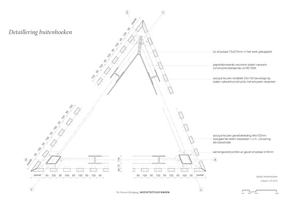 De grootste uitdaging was het realiseren van veilige en goed beloopbare trappen binnen de driehoek, de 25 meter hoogte halen en tegelijkertijd te zorgen dat de schuine lijnen in scherpe punten uitkomen. Bovendien was er voor dit project een beperkt bouwbudget (275.000 euro, inclusief honoraria). Architectuur Maken beheerde hiervoor een BIM-model, in nauwe samenwerking met de leveranciers en constructeur Rutger Snoek.