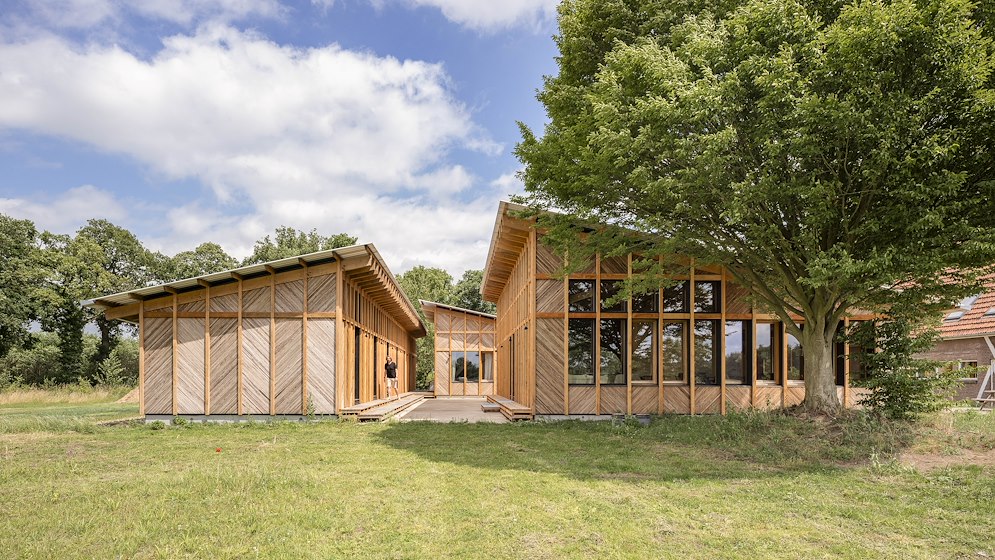 De Accoya-houten bekleding krijgt in de loop van de tijd een natuurlijke vergrijzing, waardoor het kleurverschil tussen staal en hout kleiner wordt. Zo versterkt een ton-sur-ton-kleurenpalet de hoofdvorm van de sculptuur, aldus Architectuur Maken.