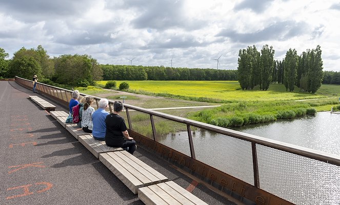 De Cirkelbrug is niet alleen een functioneel object, dat een efficiëntere verbinding en nieuwe routes ontsluit voor langzaam verkeer. Dankzij een langgerekte bank kunnen de gebruikers ook genieten van het uitzicht op onder meer het naastgelegen landschapskunstwerk De Groene Kathedraal.