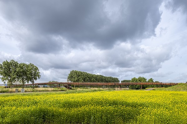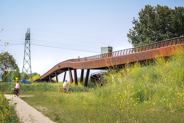 De cortenstalen Cirkelbrug is gerealiseerd in een grensgebied tussen bos en polder. Aan de zuidkant sluit de brug qua vorm aan bij de rechtlijnigheid van het polderlandschap, terwijl het bouwwerk zich aan de noordelijke kant met ronde vormen het bosgebied in ‘schrijft. “Het strenge, rechte zuidelijke deel transformeert geleidelijk, via twee vloeiende uitstulpingen, naar een spiraalvorm op de boomrijke noordoever”, verklaart wUrck.