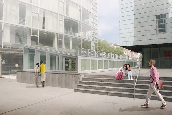 te lezen. De tekst, vrij vertaald ‘de uitersten binden elkaar, is een eerbetoon aan beeldend kunstenaar, architectuurcriticus Nic. Tummers (Heerlen, 1928-2020). De ereburger van de gemeente Heerlen was een vurig pleitbezorger voor de ‘socioruimte’, een interdisciplinaire benadering van beeldende kunst, architectuur en stedenbouw. Hij zette zich midden jaren negentig in voor het behoud van het Glaspaleis.