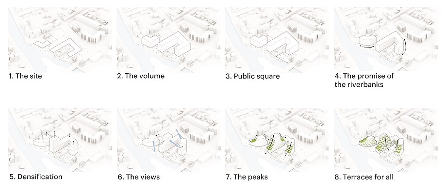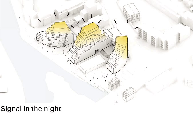 Het ontwerp bestaat uit twee gebouwen, beide met een gebogen vorm. De laagste delen liggen direct aan het water; de gebouwen lopen geleidelijk op tot drie heuvelachtige vormen, met een hoogste punt van twaalf verdiepingen. De terrasgewijze ‘hellingen’ zijn geïnspireerd op rotspartijen; de gevel van het gebouw versterkt dit concept, legt MVRDV uit.