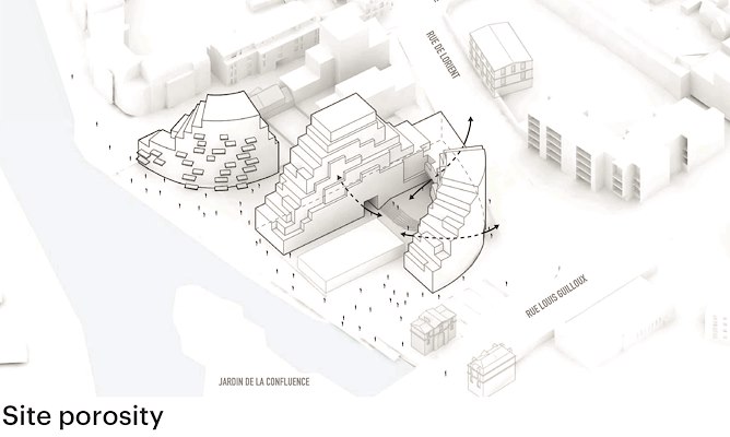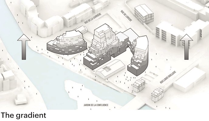 tellende wooncomplex markeert de overgang tussen het centrum en de buitenwijken. Volgens MVRDV is Ascension Paysagère een voorbeeld van hoe de noodzakelijke verdichting in Rennes eruit kan komen te zien. Het centrum van de Bretonse stad kenmerkt zich door monumentale gebouwen die onaangetast moeten blijven, waardoor de stad steeds meer richting het platteland uitbreidt. Verdichting moet die druk naar buiten verminderen.