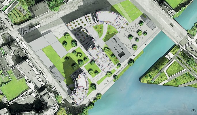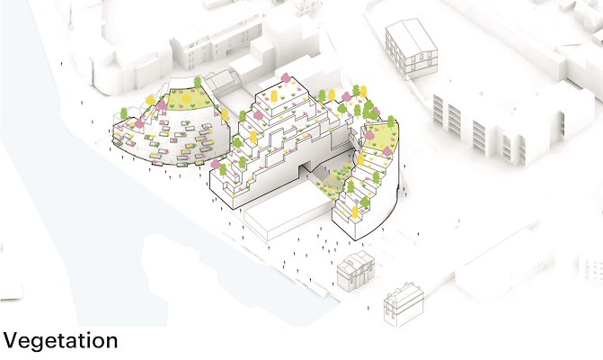 Op de trapsgewijze terrassen zijn potten geplaatst in de kleur van de gevel. Hiermee hebben de architecten het groen van de rivieroever tot bovenaan het gebouw doorgetrokken. Op de westhoek van het grotere blok, tussen de twee toppen van het gebouw, ligt zelfs een tuin met fruitbomen. In het ontwerp is bovendien veel aandacht besteed aan een verzorgde publiek toegankelijke ruimte.