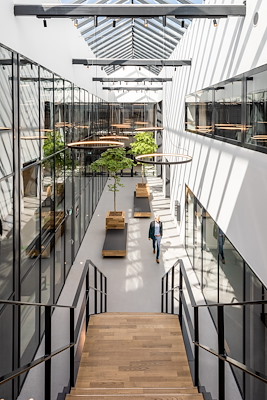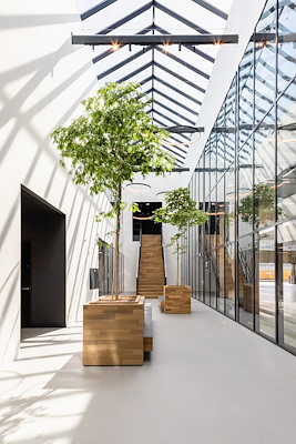 Binnen zijn de twee verdiepingen integraal met elkaar gekoppeld. Alle ondersteunende functies zitten zowel aan de noord- als aan de zuidzijde waardoor de looplijnen kort en efficiënt zijn. Een atrium, tevens de entree van het gebouw, verbindt de kantoren met de productiehal. Ter contrast met het vele staal en glas in het gebouw is deze ruimte ingericht met warme, natuurlijke materialen en groen.