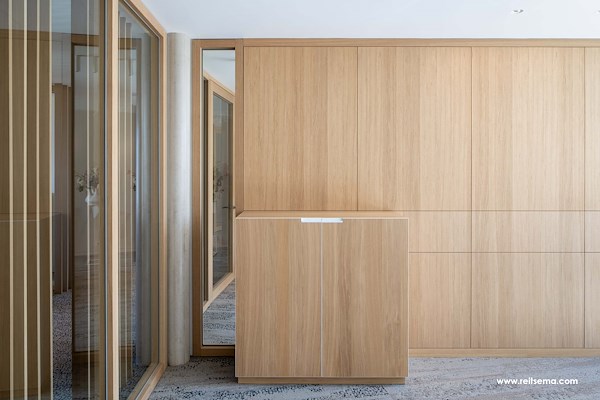 “Verdiepingshoge deuren en kozijnen, plinten en wandkasten zijn qua uitlijning en materiaalkeuze op elkaar afgestemd. De op maat gemaakte kozijnen geven daglicht ruim baan. Tegelijk is de inkijk minimaal door lamellen, hoekverdraaiing en natuurlijke spiegeling. Subtiele spotverlichting leidt de kijkrichting door de corridors”, aldus het architectenbureau.
