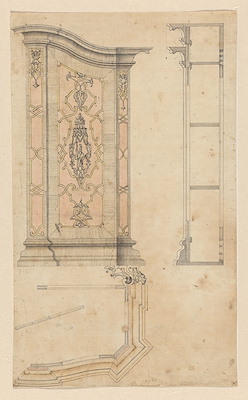 Ontwerp voor een kast met marqueterie van een figuur onder een baldakijn, anoniem, ca. 1740 - ca. 1750. Collectie Rijksmuseum
