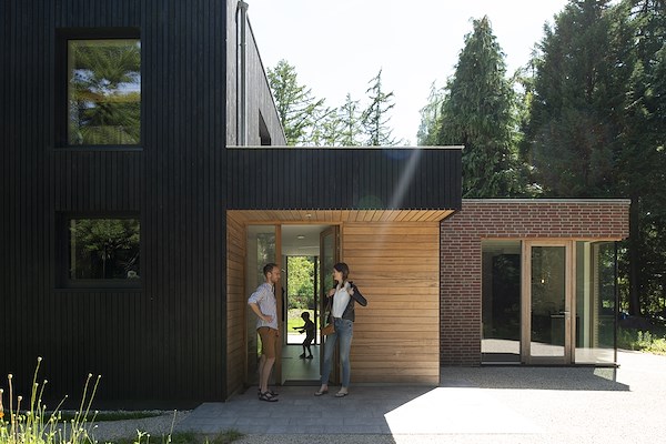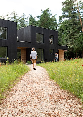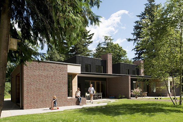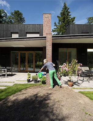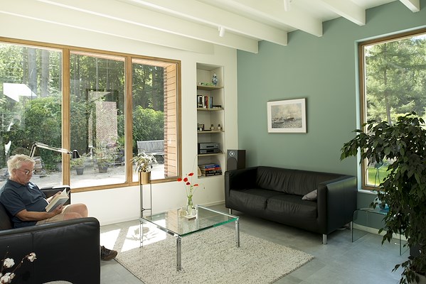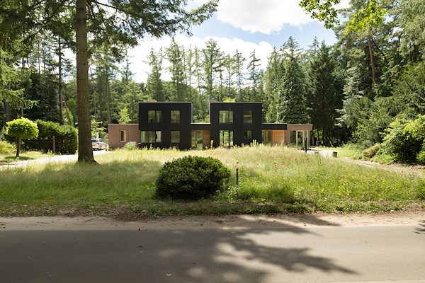 De leefruimten zijn zo georiënteerd dat er op een vanzelfsprekende manier enige afstand is. Hierdoor is het niet nodig om hoge erfafscheidingen in de tuin te maken en kijken de bewoners van beide woningen vrij uit over het bosrijke perceel.