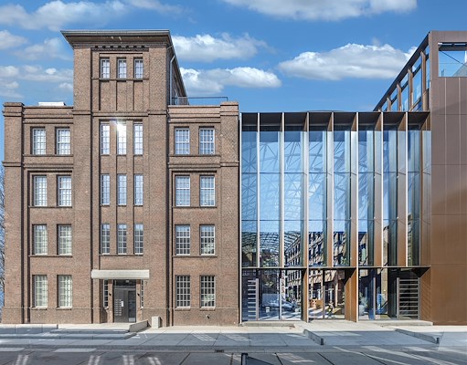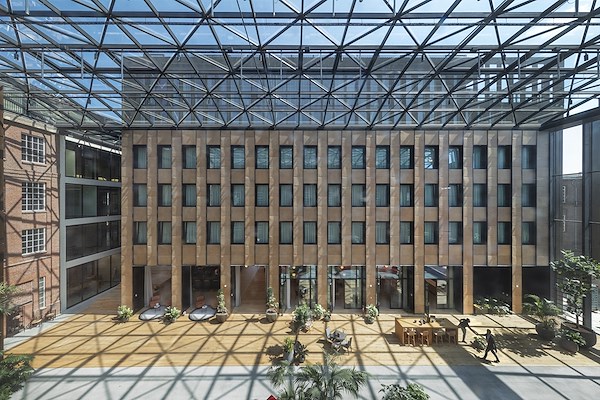 Het complex ademt zijn historie: terwijl de rode bakstenen muren getuigen de oorspronkelijke industriƫle architectuur tonen, verwijzen nieuwe atriumwanden met leren bekleding naar de historische productie. In het royale atrium komen oud en nieuw samen. De diepe lamellen van de nieuwe gevel zijn subtiel voorzien van historische afbeeldingen.