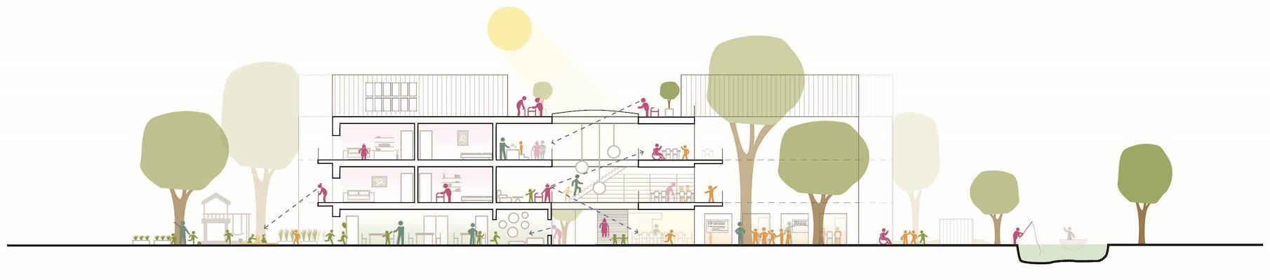 Het IKC bestaat weer uit een basisschool voor tweehonderd leerlingen, een dagopvang en een buitenschoolse opvang. “Uiteraard zullen we de interactie tussen alle generaties stimuleren. We maken ruimte voor informele ontmoetingen. We sturen juist op dit sociale contact. De inrichting van de ruimte heeft grote invloed op het gebruik ervan. Er zijn letterlijk en figuurlijk geen drempels. Het ontwerp nodigt juist uit om de blik van jong en oud te verbreden”, vertelt Carina Nørregaard, architect en partner bij LIAG architecten en bouwadviseurs.