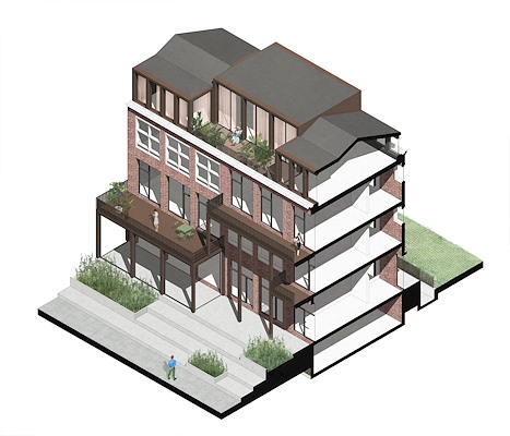 Met respect voor de monumentale waarde van het gebouw maakt het architectenbureau drie essentiële ingrepen om van het schoolgebouw en woongebouw te maken. Dit zijn: een doorbraak in het midden van het hoofdgebouw voor een nieuwe entree, een toegevoegde gevellaag met balkons, terrassen en pergola’s, en een toegevoegde verdieping met penthouses.