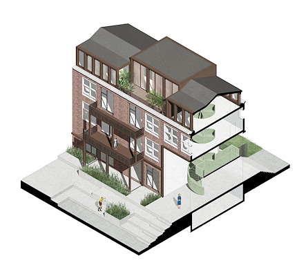 Een nieuwe entree aan de noordzijde geeft het gebouw een logisch adres. De toevoeging van balkons en erkers op diverse plekken zorgen voor een levendige uitstraling, aldus Space&Matter. Iedere woning, inclusief de nieuwe penthouses op het bestaande gebouw, heeft een eigen buitenruimte in de vorm van een tuin, balkon of dakterras.