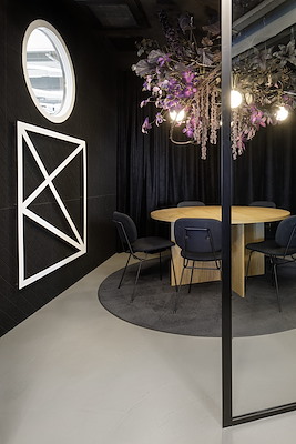 De vergaderruimte is gekoppeld aan Knowledge. De ruimte is gematerialiseerd als een geheel zwarte doos, aan binnen- en buitenzijde voorzien van PET-panelen met patroon en fluwelen gordijnen. In al haar zachtheid bewaart deze ruimte kennis en geheimen, verklaren de ontwerpers.