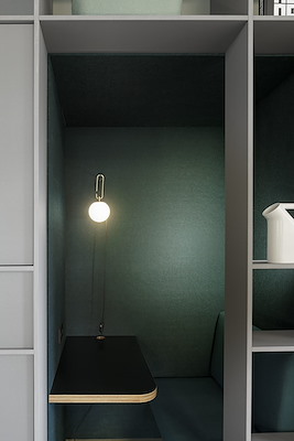 Achter een verdiepingshoge kast uit grijs MDF gaat een aantal gesloten ruimten schuil, waaronder een opslagruimte en twee eenpersoons kantoorruimten. Verder biedt de kast plek aan een kleine telefooncel, voorzien van donkergroene PET-panelen, een klein tafeltje en een donkergroen gestoffeerde bank.