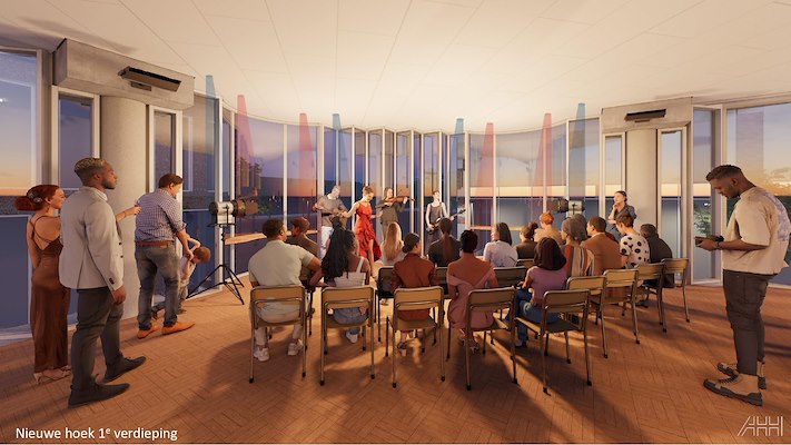 in 2014 behouden bleef. De hoek waarin de nieuwe entree wordt gerealiseerd, behoudt in de basis zijn uitstraling maar krijgt een veel transparanter karakter. Op het dak van de entree komt groen.