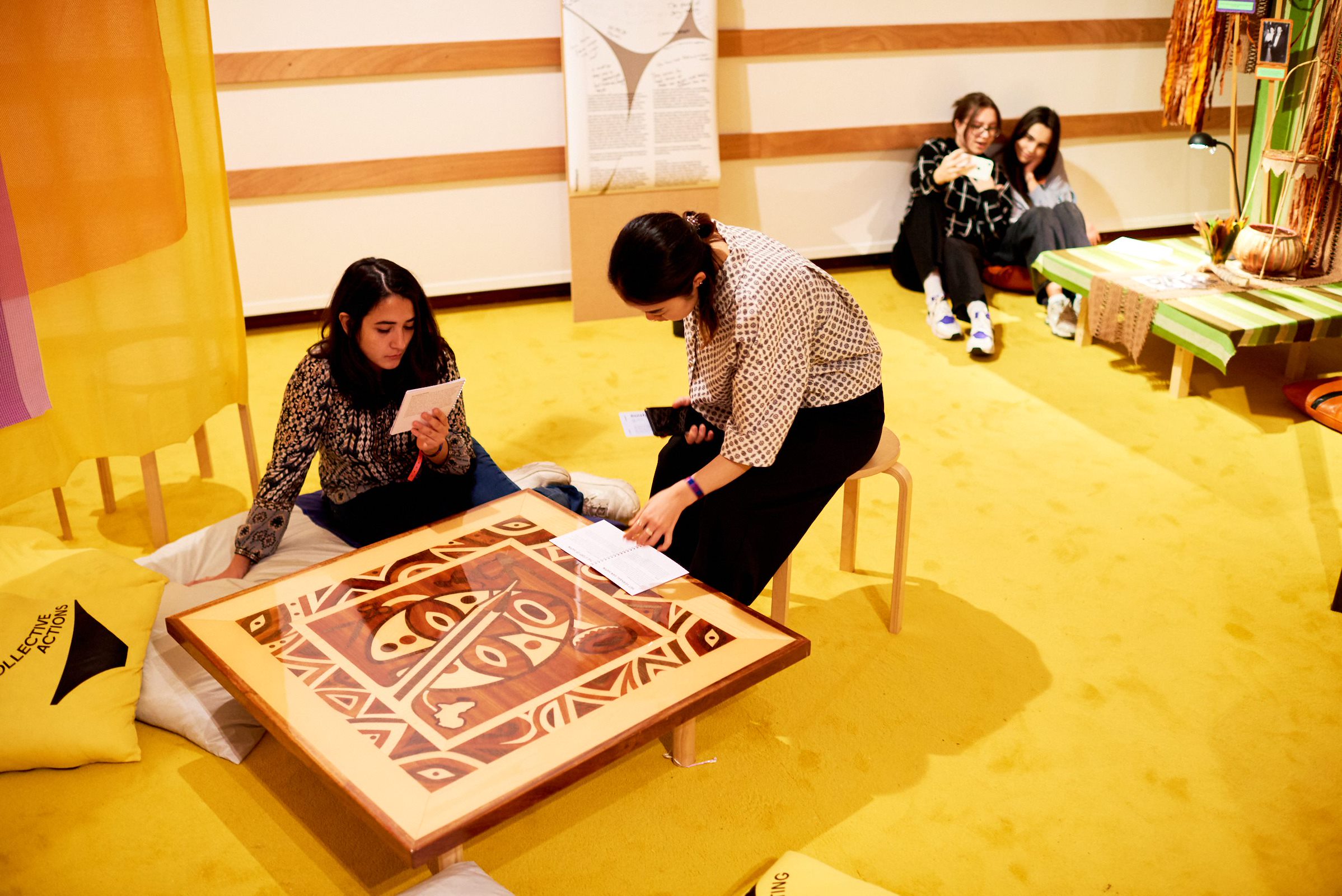 Bij collectieve actie ondernemen ontwerpers, projectleiders of andere betrokkenen iets samen met de deelnemers als middel om tot een gesprek te komen. Een voorbeeld is een initiatief uit de eigen praktijk: Raviv startte met Pim van der Mijl in 2015 De Voorkamer in de multiculturele wijk Lombok in Utrecht. De Voorkamer is een ontmoetingsplek voor de lokale gemeenschap, waar vanuit de verschillende achtergronden gezamenlijk activiteiten worden ondernomen en vormgegeven. Tijdens DDW 2022 presenteerde de Embassy twee tafels uit De Voorkamer, waar ze in co-creatie zijn gemaakt. Tijdens workshops werden verhalen en herinneringen verzameld en vertaald naar patronen, die met hout zijn ingelegd in de tafels. Die beelden nodigen uit tot het verdere delen van persoonlijke verhalen.